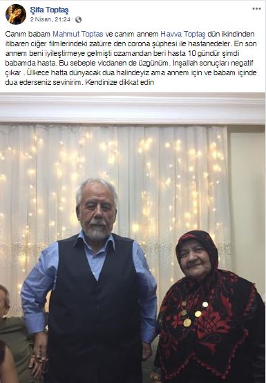 Şifa Toptaş'ın paylaştığı yazı şu şekilde, "Canım babam Mahmut Toptas ve canım annem Havva Toptaş dün ikindinden itibaren ciğer filmlerindeki zatürre den corona şüphesi ile hastanedeler. En son annem beni iyileştirmeye gelmişti ozamandan beri hasta 10 gündür şimdi babamda hasta. Bu sebeple vicdanen de üzgünüm. İnşallah sonuçları negatif çıkar . Ülkece hatta dünyacak dua halindeyiz ama annem için ve babam içinde dua ederseniz sevinirim. Kendinize dikkat edin".
