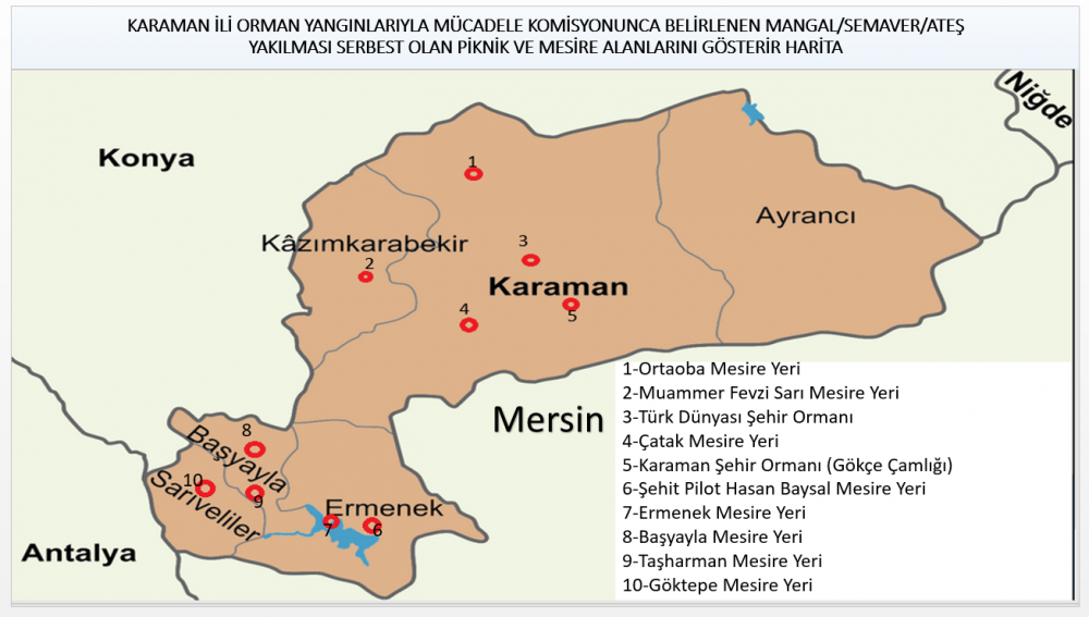 Karaman Orman Yangınları ile Mücadele Komisyonu tarafından yapılan açıklamada, "Karaman İli Merkez İlçesi Gökçe Köyü sınırlarında bulunan Karaman Şehir Ormanı A Tipi Mesire Yeri, Siyaser Mahallesi sınırları içerisinde bulunan Türk Dünyası D Tipi Şehir Ormanı Mesire Yeri, Ortaoba Köyü sınırları içerisinde bulunan C Tipi Mesire yeri, Çatak köyü sınırları içerisinde bulunan C Tipi Mesire yeri, Karaman İli Kazımkarabekir İlçesi Gökçimen mevkisinde bulunan Muammer Fevzi Sarı C Tipi mesire yeri, Karaman İli Ermenek İlçesi Körkuyu Mevkiinde bulunan Şehit Pilot Hasan BAYSAL C tipi mesire yeri, Ermenek A tipi mesire yeri, Karaman İli Başyayla İlçesi, Başyayla C tipi mesire yeri, Hisarönü mevkiinde bulunan Taşharman C tipi mesire yeri ile Karaman İli Sarıveliler İlçesi Göktepe Kasabasında bulunan Göktepe C tipi mesire yeri içerisinde mangal, semaver vb. ateş yakılabilecek alanlar olup haritası ektedir. Bu belirtilen alanlar haricindeki ormanlık alanlarda ateş yakmak yasaktır.