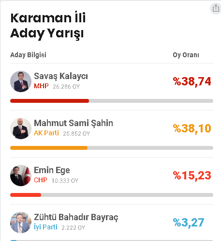 Saat 19:50 itibariyle Karaman'da sonuçlar bu şekildedir...