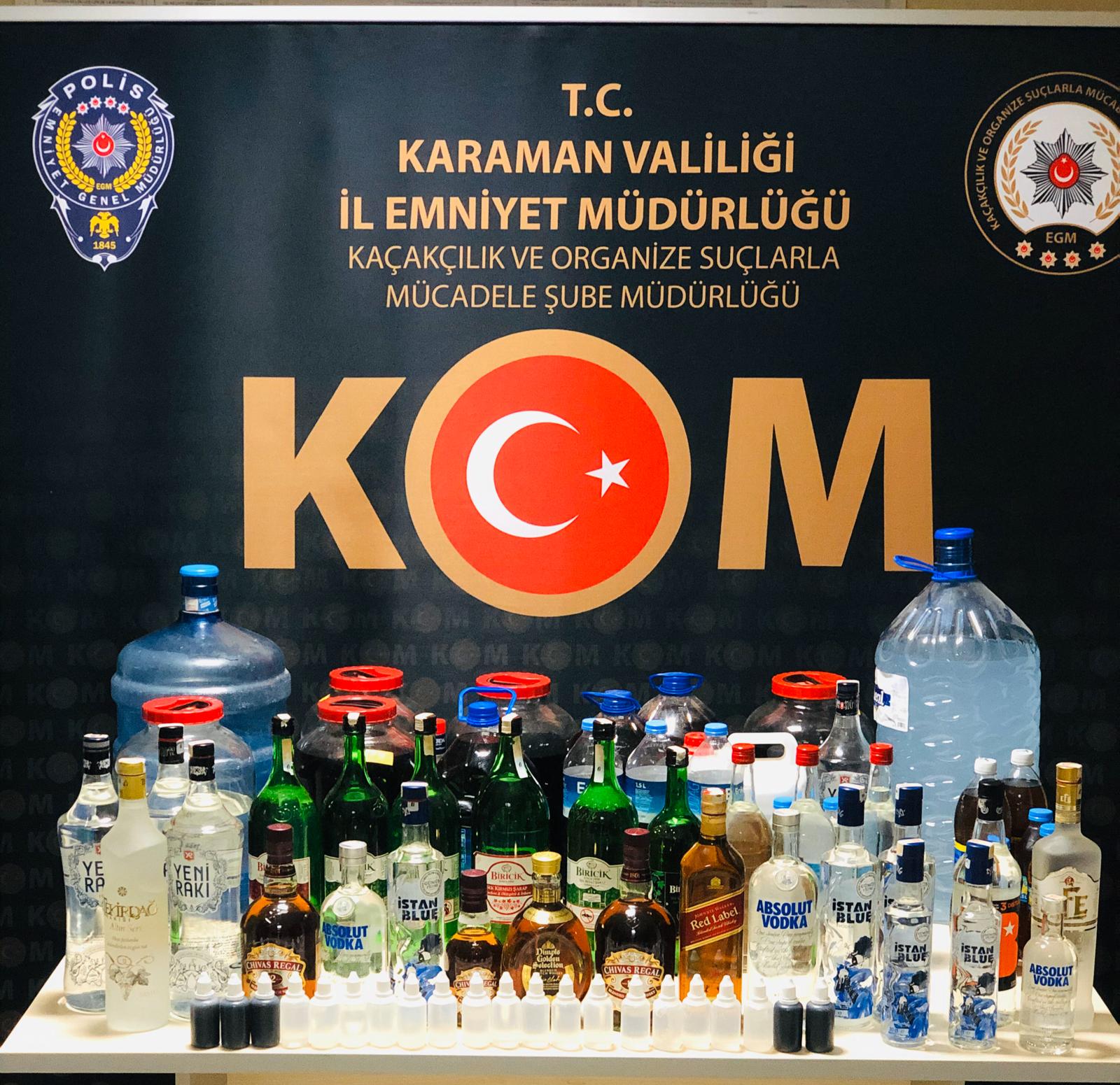 Karaman'da, polis ekiplerince düzenlenen operasyonda, sahte içki üretiminde kullanılan melzeme ile çok sayıda alkol ele geçirildi.